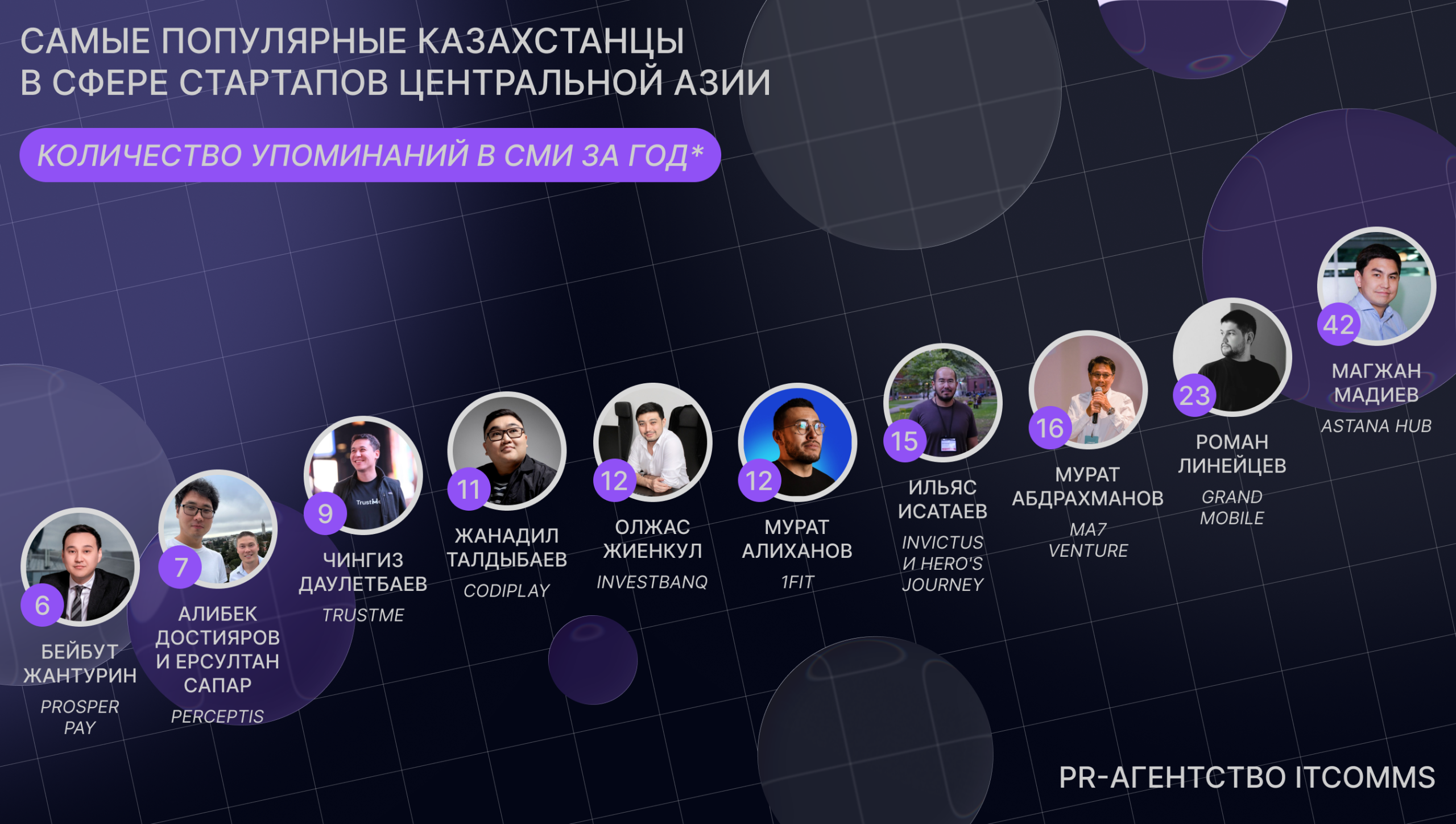 PR-агентство ITCOMMS представило рейтинг медиавлияния казахстанцев из сферы стартапов в Центральной Азии. Первое место занял CEO Astana Hub Магжан Мадиев с более чем 40 упоминаниями в региональных СМИ за год. В тройку лидеров также вошли венчурный инвестор Мурат Абдрахманов и создатель мобильной игры Grand Mobile Роман Линейцев.